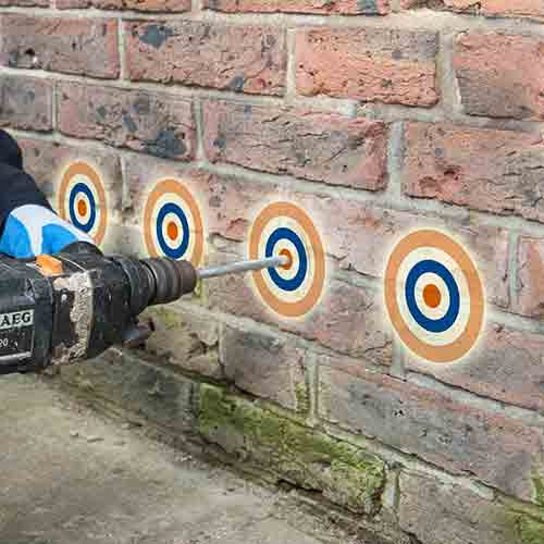 Fully insert the nozzle into the first drilled hole, and then inject Dryzone cream while withdrawing the nozzle at a steady rate. Stop injecting just before removing the nozzle from the wall. Repeat for remaining holes.